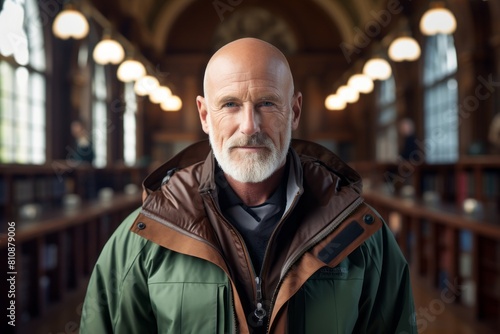 Portrait of a merry man in his 50s wearing a functional windbreaker isolated in classic library interior