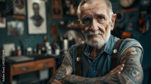 Portrait of a old man tattoo artist at studio tattoo