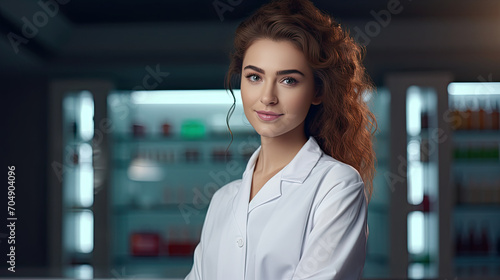 Portrait of a pharmacy healthcare worker in a white coat.