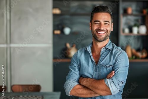 Portrait of a smiling man in his 30s with arms crossed isolated in modern minimalist interior