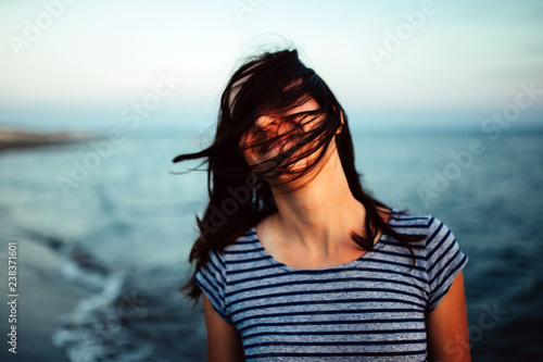 Portrait of a smiling young woman with closed eyes and hair on her face at the sand sea beach