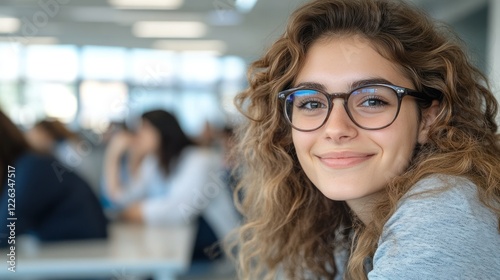 Portrait of a Smiling Young Woman with Curly Hair and Glasses in a Blurred Classroom Background
