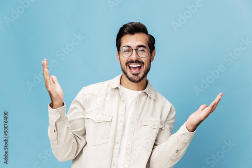 Portrait of a stylish man smile with teeth and happiness in glasses for farsightedness and myopia, on a blue background in a white T-shirt, space space