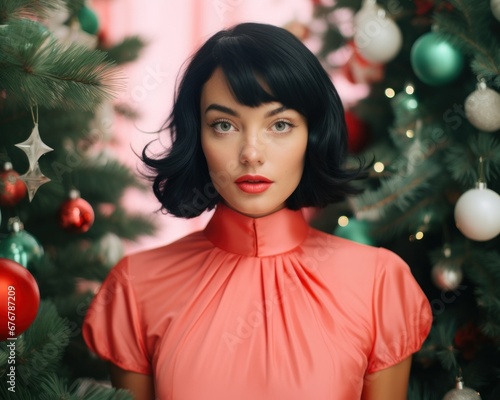 Portrait of a stylish woman in vintage attire posing in front of a beautifully decorated christmas tree