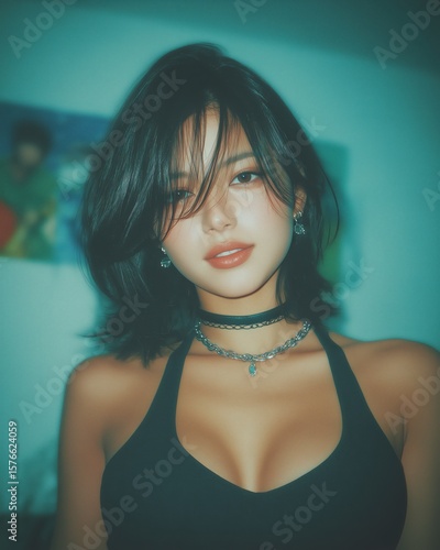 Portrait of a stylish young woman with jewelry wearing a black tank top indoors