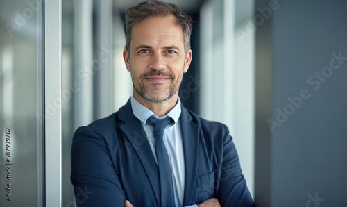 Portrait of a successful middle-aged businessman in his workplace. Generative AI.