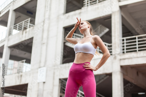 Portrait of a tired red-haired fitness woman on the background of an urban location