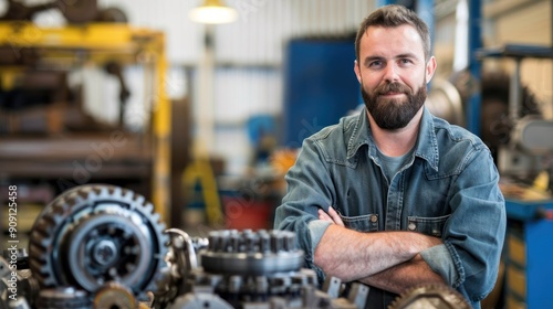 Portrait of a transmission mechanic with transmission parts, showing diagnostics