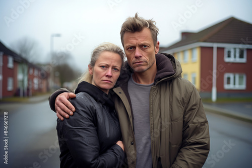 Portrait of a Unhappy Worried Sad Couple Standing on a Suburban Street with Overcast Sky, Highlighting Emotional Distress and Suburban Life