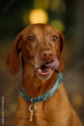 portrait of a vizsla dog with tongue in blue collar in the autumn sunny green park with blur background