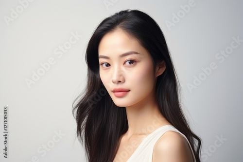 Portrait of a woman with long dark hair, wearing a white top, against a light background. She has a calm expression, looking directly at the camera.
