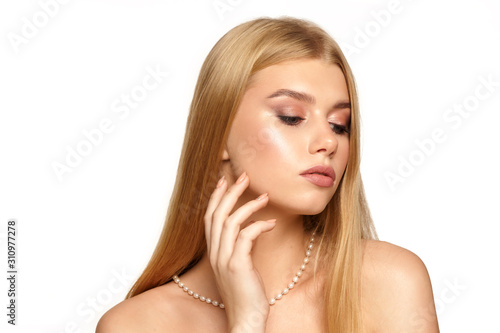 Portrait of a young girl with natural make-up on a white background. Beautiful Spa Model Girl with Perfect Fresh Clean Skin. Youth and Skin Care Concept