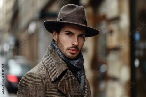 Portrait of a young man with classic style wearing a hat and coat in an urban setting
