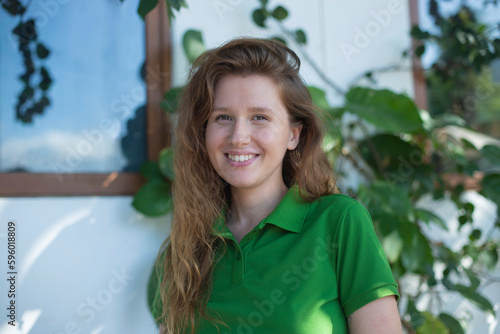 portrait of a young positive girl near her house, eco concept, country life, spring, summer, garden, green city