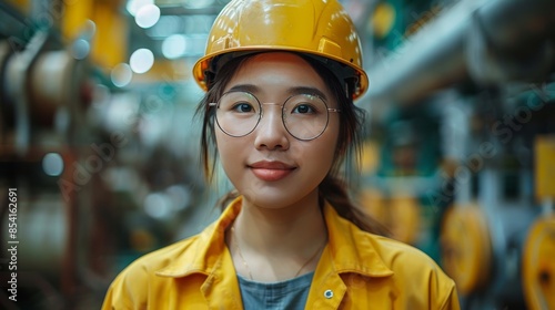 Portrait of a young smiling female engineer wearing a yellow jacket and protective glasses in an industrial facility