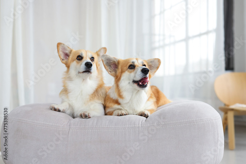 Portrait of adorable, happy smiling dog of the corgi breed. Beloved pet in the beautiful home.