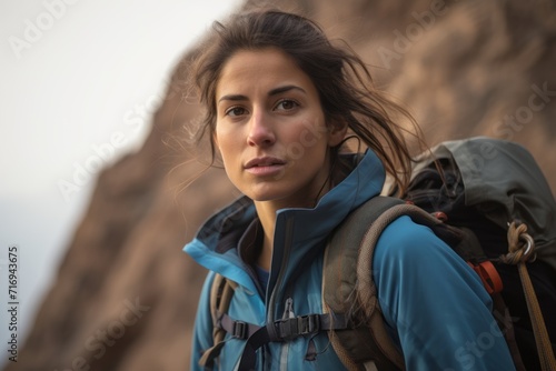 Portrait of an inspired girl in her 30s practicing outdoor rock climbing. With generative AI technology