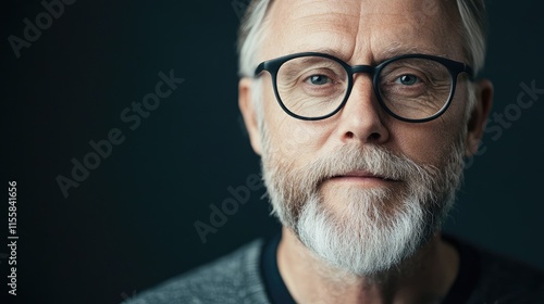 Portrait of an older man with glasses and a beard on a dark background with ample copy space for adding text or messages
