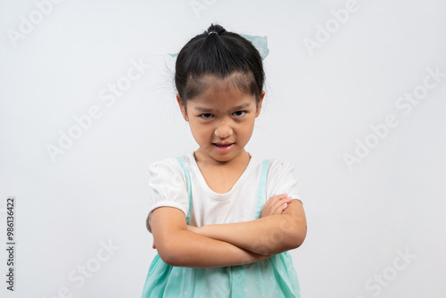 Portrait of Asian angry and sad little girl on white isolated background, The emotion of a child when tantrum and mad, expression grumpy emotion. Kid emotional control concept