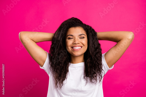 Portrait of attractive dreamy glad cheerful girl resting nap good mood isolated over vivid pink fuchsia color background