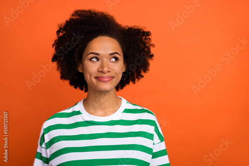 Portrait of attractive minded cheery smart girl overthinking copy blank space isolated over bright orange color background