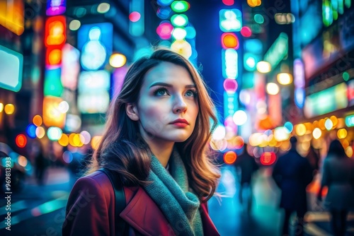 Portrait of attractive young excited woman smiling happy to be in urban cinematic environment. Charming beautiful woman walking down streets of modern city with neon lights at night.