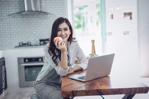 Portrait of beautiful young latin woman talking over the phone while cooking in kitchen