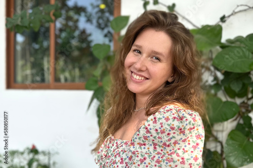 Portrait of beautiful young woman gardener in home fresh natural garden with growing green leaves, girl in summer dress is smiling and looking at camera. Eco village house or cafe