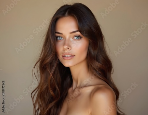 Portrait of beautiful young woman with long brown wavy hair. She has striking blue eyes, perfect skin. Natural makeup, healthy complexion. Elegant, attractive model looks to camera.