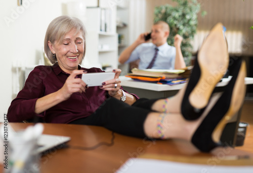 Portrait of carefree aged businesswoman playing online game on smartphone during business hours, sitting at workplace with legs resting on table. Avoiding work concept