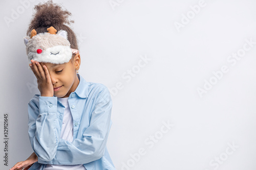 portrait of child, tired little girl, child want to sleep. girl in mask for sleeping. isolated white background