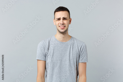 Portrait of crying upset dissatisfied young man in casual clothes standing, looking camera isolated on grey wall background in studio. People sincere emotions, lifestyle concept. Mock up copy space.