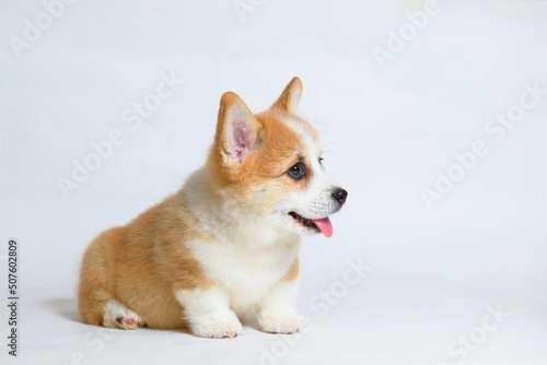 Portrait of cute puppy corgi. Little smiling dog on gray background. Free space for text. Dog for advertising tape.