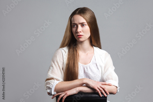 Portrait of emotional beautiful young model actor with long brown hair in white t-shirt sitting on black chair and looking away with depressed eyes. Indoor, studio shot. isolated on white background.