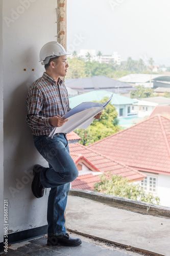 Portrait of engineer checking the blueprint with commitment to success at construction site