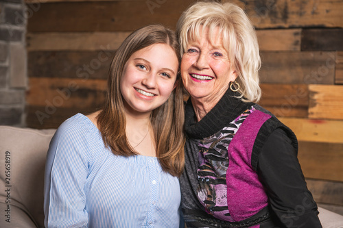 Portrait of grandmother with their teenage granddaughter sitting on sofa at home