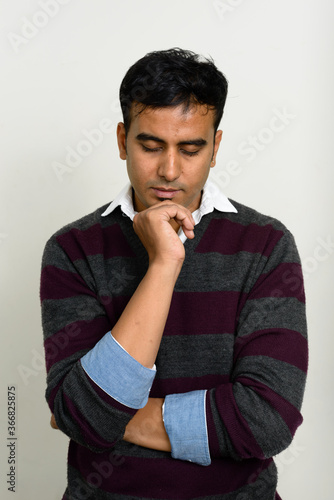 Portrait of handsome Indian man against white background