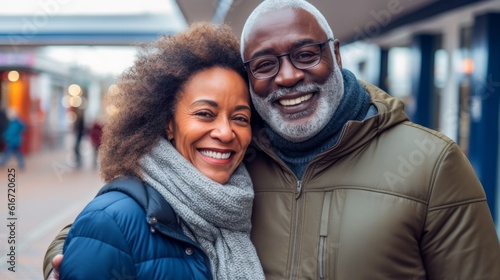 Portrait of happy African American couple looking at camera in the city. Portrait of smiling couple standing in street, lifestyle. Cheerful african american couple embracing each other. AI Generated.