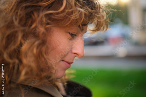 Portrait of happy mature woman looking at camera. Successful proud woman in city street at sunset. Satisfied Caucasian woman in formal clothing smiling outdoors. High quality photo
