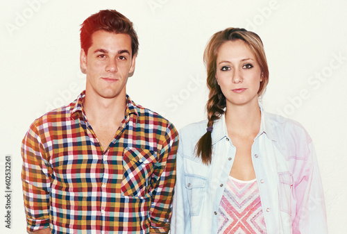 Portrait of hipster couple, serious face and gen z fashion with university culture in youth. Trendy students, woman and man in instant picture on college date, cool people on white wall background.