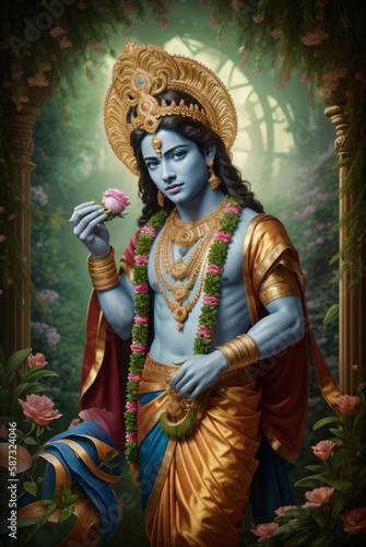 Portrait of Lord Krishna wearing a a crown with peacock feathers. Generative AI.