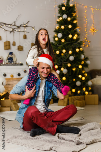 Portrait of loving dad with daughter on his shoulders decorating beautiful Christmas tree with toys and decoration at home.