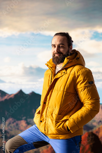 Portrait of male trekker in warm clothing takes in the sweeping mountain scenic view, sense of freedom that comes with high altitude exploration. Nature lover enjoys fresh air and wilderness.