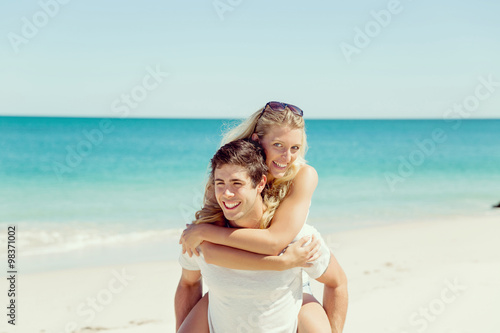 Portrait of man carrying girlfriend on his back