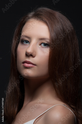 Portrait of pretty young brunette posing at camera