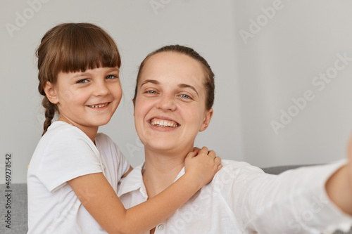 Portrait of satisfied woman and little girl making selfie via smart phone, looking at cell phone camera, point of view photo, happy people mother and daughter having video call.