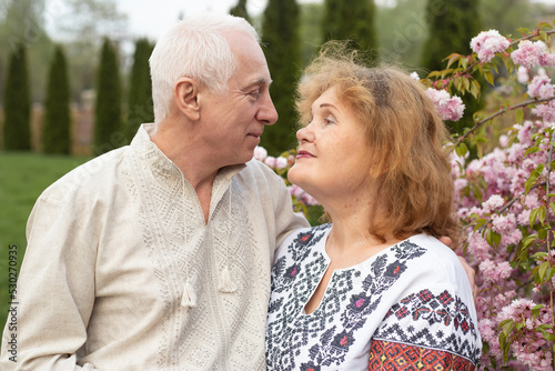 portrait of senior mature couple wearing Ukrainian embroidered shirt standing in park in spring or summer near sakura blooming tree