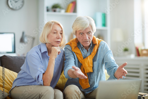 Portrait of shocked senior man looking at computer screen while using laptop at home, copy space