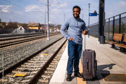 Portrait of smiling African American man standing on train platform with suitcase, waiting for departure.