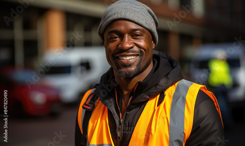 Portrait of smiling African American man wearing safety vest and winter clothes, looking at camera